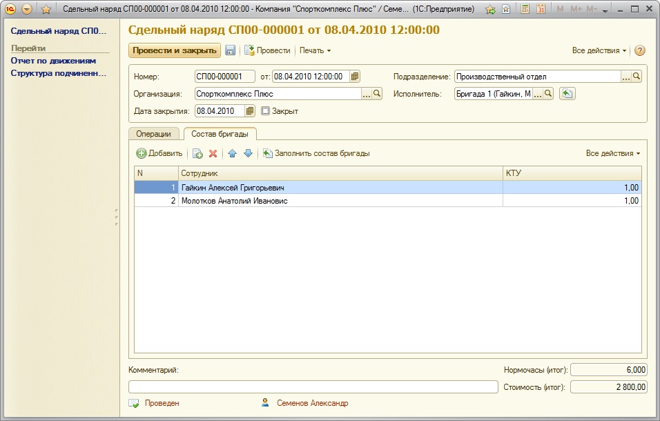 Рис. 231. Состав бригады и коэффициент трудового участия каждого работника в документе "Сдельный наряд"