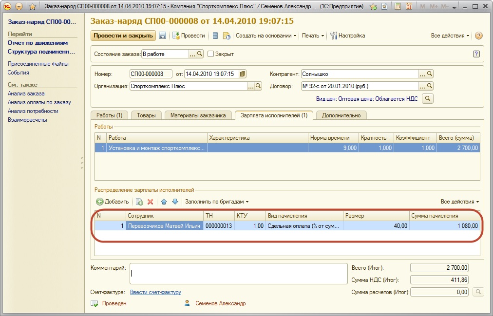 Таким образом, для начисления сдельной заработной платы в программе "1С:Управление небольшой фирмой 8" применяются документы "Сдельный наряд" и "Заказ-наряд".
