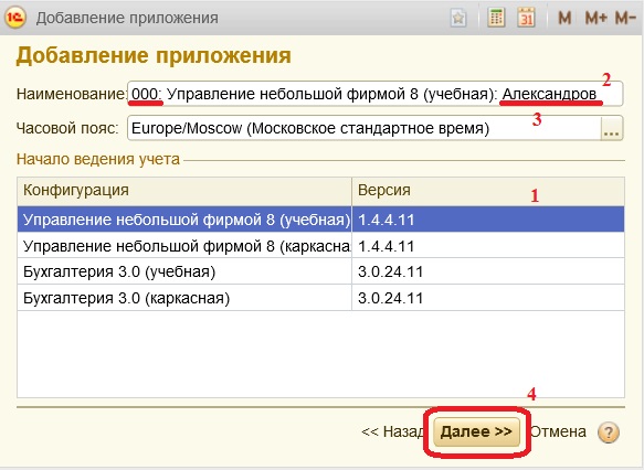 Рассмотрим первый вариант создания новой рабочей области с пустой информационной базой приложения «1С:Упраление небольшой фирмой 8» для преподавателя Чистов.