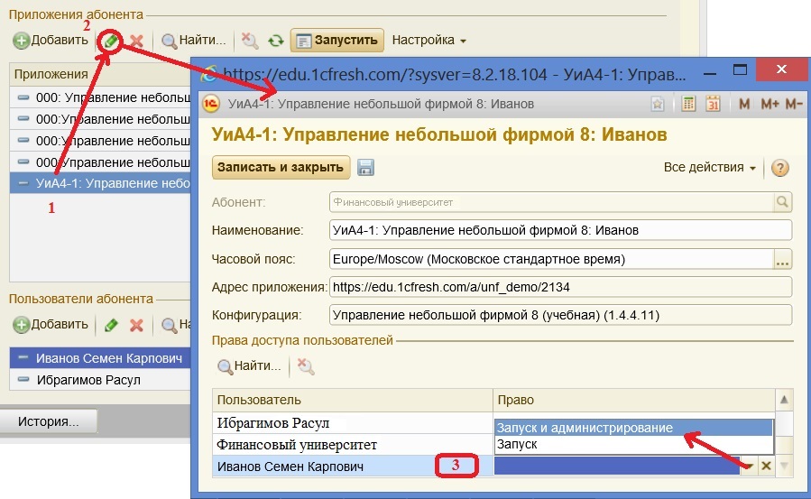 Помимо этого еще один пользователь – владелец абонента с именем «Финансовый университет» имеет право «Запуска и администрирования».