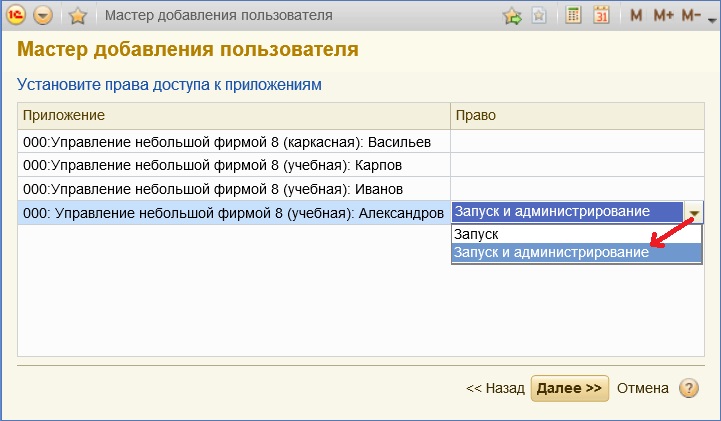 По кнопке Далее перейдем к четвертому шагу работы мастера добавления пользователя (рис. 1-12), где потребуется определить роль пользователя по отношению к каждой информационной базе (рабочей области) из списка «Приложения».