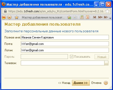 Будем исходить из того, что у нас нет студентов и преподавателей, зарегистрированных во edu.1cFresh.com, и поэтому рассмотрим вариант создания нового пользователя.