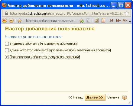 По кнопке Далее перейдем к третьему шагу работы мастера добавления пользователя, где потребуется определить роль пользователя по отношению к абоненту в целом.