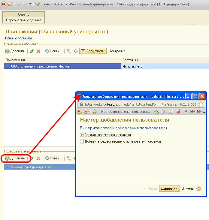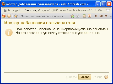 Второй вариант используется в том случае, если необходимо в список пользователей текущего абонента включить пользователя, который уже зарегистрирован в сервисе на сайте edu.1cFresh.com, например, как владелец или пользователь другого абонента.