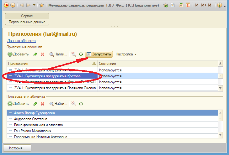Кроме того, осуществить запуск любого приложения можно непосредственно из Менеджера сервиса. Для этого в списке «Приложения абонента» надо выбрать требуемую информационную базу и воспользоваться экранной кнопкой (рис. 1-18).