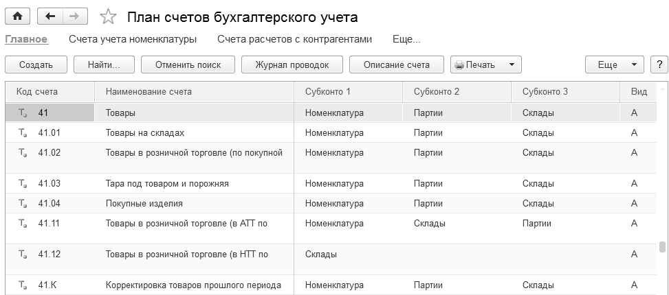 Для обобщения информации о товарах используется счет 41 "Товары". Этот счет делится на субсчета, и они показаны на рисунке. 13.1.1.