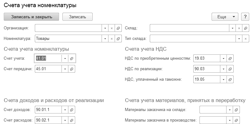 Счета учета, устанавливаемые по умолчанию в документах по поступлению ТМЦ, задается в регистре сведений "Счета учета номенклатуры" (рис. 13.1.3).