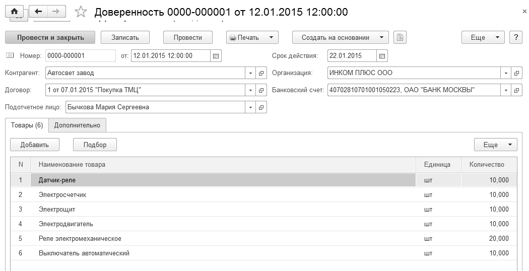 12.01.2015 года выписана доверенность сотруднику Бычковой М. С. для завода "АВТОСВЕТ" по договору  № 1 от 07.01.2015 "Покупка ТМЦ" по номенклатуре, указанной на рисунке 13.1.5.
