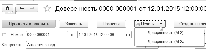 Распечатать доверенность можно при помощи кнопки "Печать", которая располагается в верхней части документа, его шапке. Можно распечатать доверенности по форме М-2 и М-2а (рис. 13.1.6).
