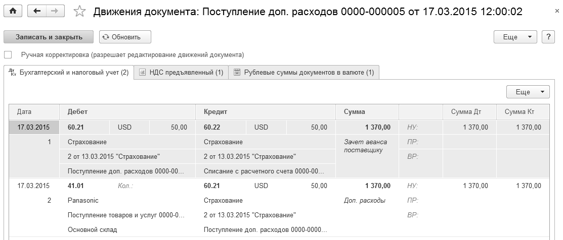 Рис. 13.6.10. Движения документа "Поступление доп. расходов"