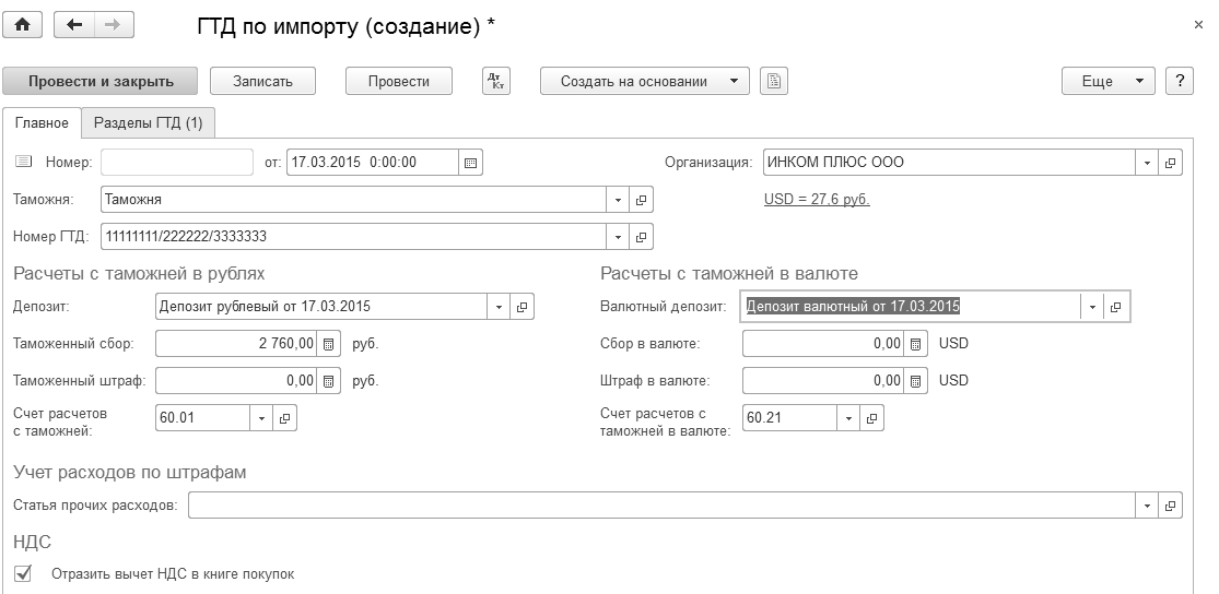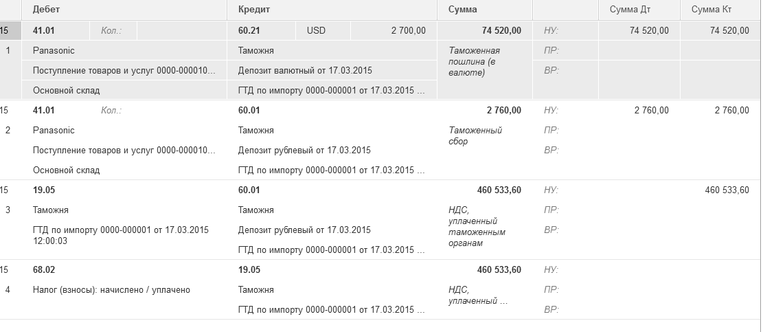 17.03.2015 года создайте документ "ГТД по импорту". На Таможне были уплачены: