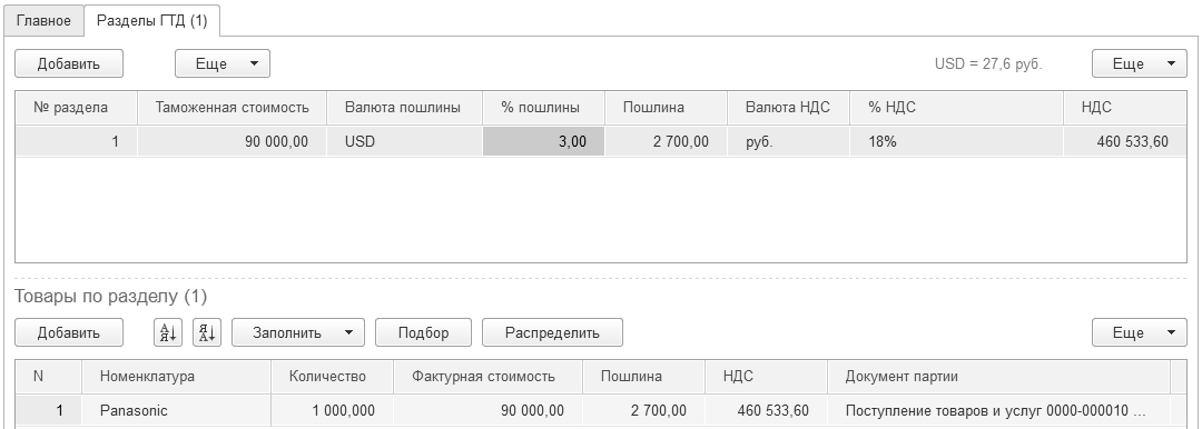 Перейдите на закладку "Разделы ГТД". Ввоз товара "Panasonic" оформляется на таможне, при этом была уплачена пошлина 3% и уплачен НДС с таможенной стоимости 460 533,60 руб. (рис. 13.6.12).