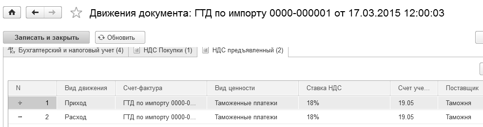 Рис. 13.6.14. Движение документа "ГТД по импорту",