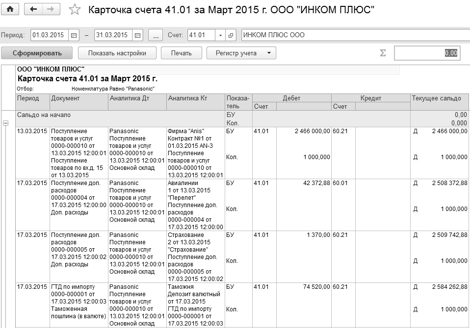 Создайте отчет по счету 41.01 за март 2015 года, настройке его с отбором по номенклатуре "Panasonic".