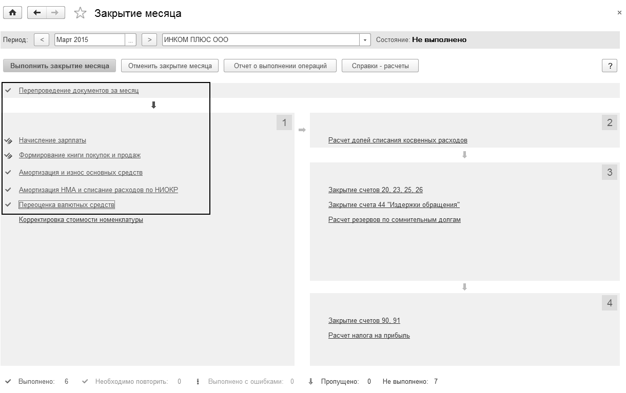 После перепроведения документов марта по верхней ссылке,  переходите на нижние  ссылки "Амортизация и износ ОС", "Амортизация  НМА и списание расходов НИОКР", проводя эти документы. Только тогда Вы сможете провести регламентный документ "Переоценка валютных средств" за март. После перепроведения всех документов окно помощника "Закрытие месяца" должно выглядеть так, как показано на рисунке 13.6.16.