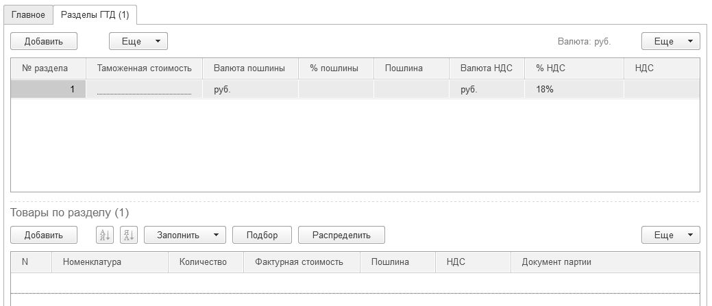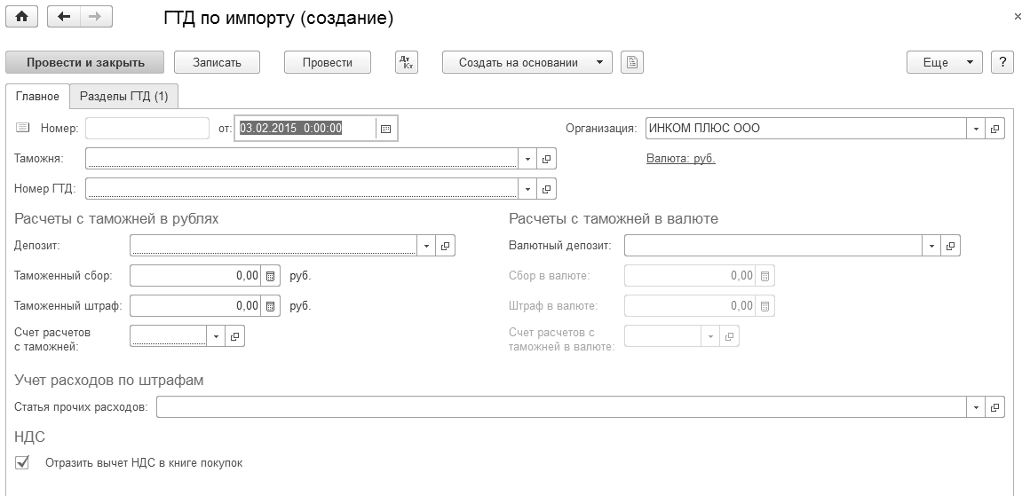 Документ "ГТД по импорту" отражает таможенные сборы (рублевые или валютные), номер ГТД при поступлении импортного товара. Состоит этот документ из закладок: "Главное" и "Разделы ГТД.