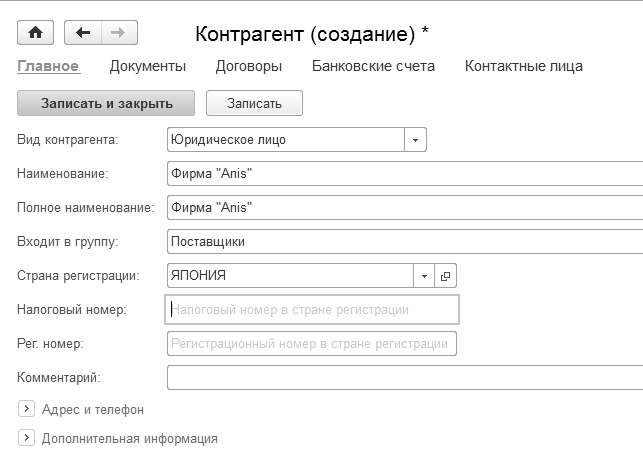 Создайте контрагента "Anis" (рис. 13.6.4). Занесите  в усеченный классификатор  страну "Япония".