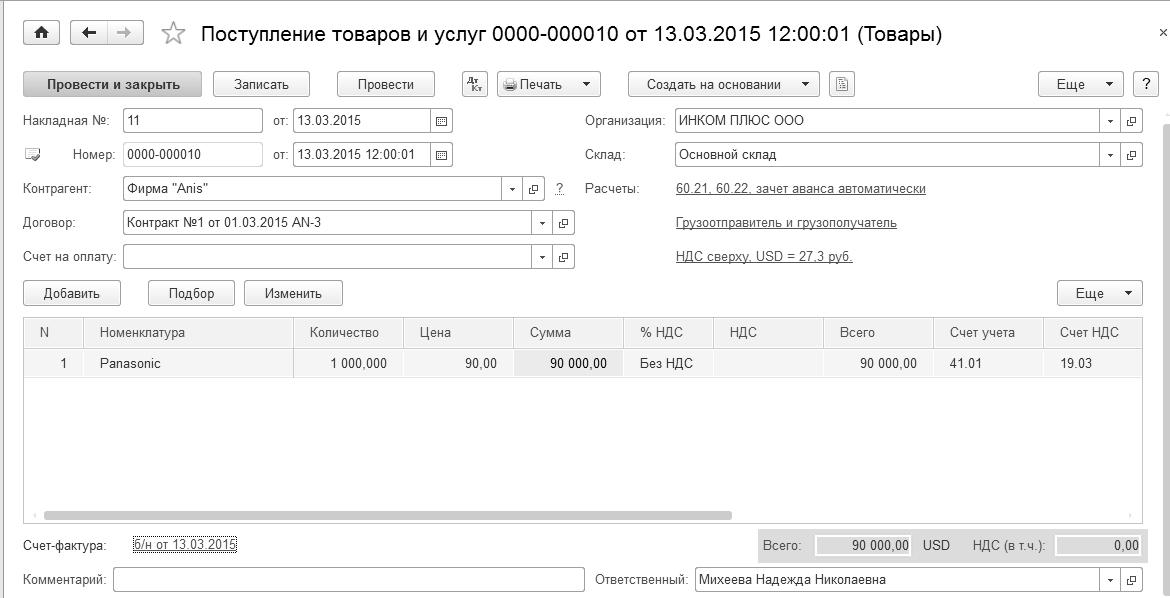 13.03.2015 года создайте документ "Поступление товаров и услуг" на получение 1 000 штук товара "Panasonic" от фирмы "Anis" по контракту № 1 от 01.03.2015 "AN-3" на сумму 90 000 дол. Контрактная стоимость товара "Panasonic"  должна быть пересчитана в рубли для целей бухгалтерского учета по курсу ЦБ РФ, действующему на дату перехода права собственности на них к российской фирме-импортеру, т.е. на 13 марта 2015 года. Накладная №15 от 13.03.2015 года.