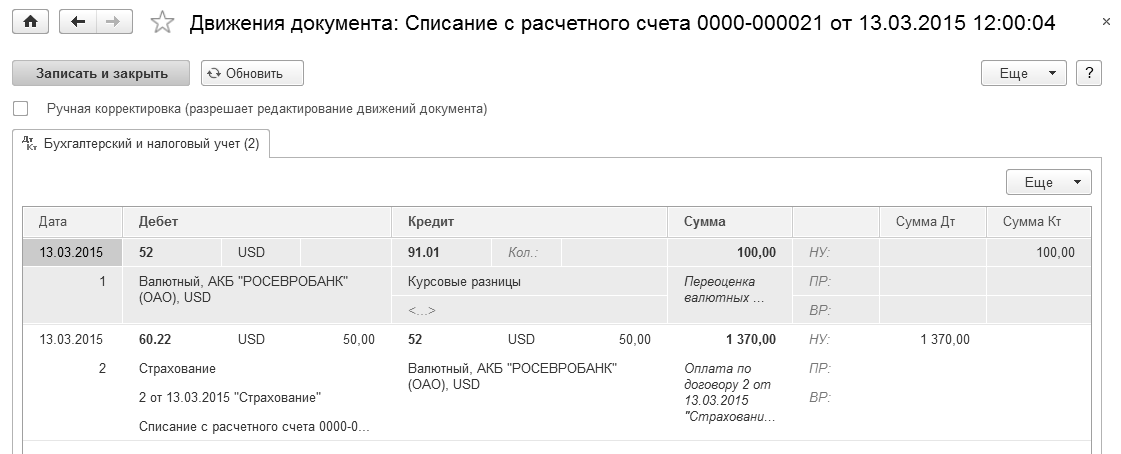 Проводки документа "Списание с расчетного счета" представлены на рисунке 13.6.7. На момент совершения операции по списанию денежных средств произошла переоценка валюты. 4 марта курс был 27,30 руб./дол., на 13.03 стал 27,40 руб./дол..  На момент операции было 1 000 долларов. Курсовая разница – 100 руб.