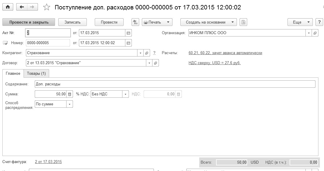 17.03.2015 года создайте документ "Поступление доп. расходов".  Отразите услуги по страхованию груза, оказанные  контрагентом "Страхование" по договору № 2 от 17.03.2015 г. "Страхование". Сумма услуги составила 50 дол.,  НДС не облагается.  ООО "Страхование" представило акт № 2 и с/ф № 2 от 17.03.2015 г. Отразите НДС в книге покупок.