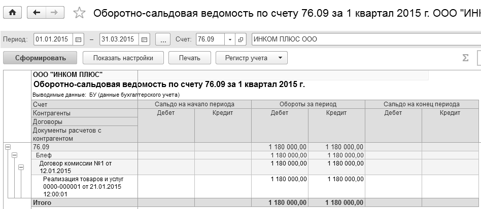 Сформируйте отчет "Оборотно-сальдовая ведомость по счету" 76.09 за 1 квартал 2015 года. Остатка на этом счете быть не должно (рис. 13.4.10).