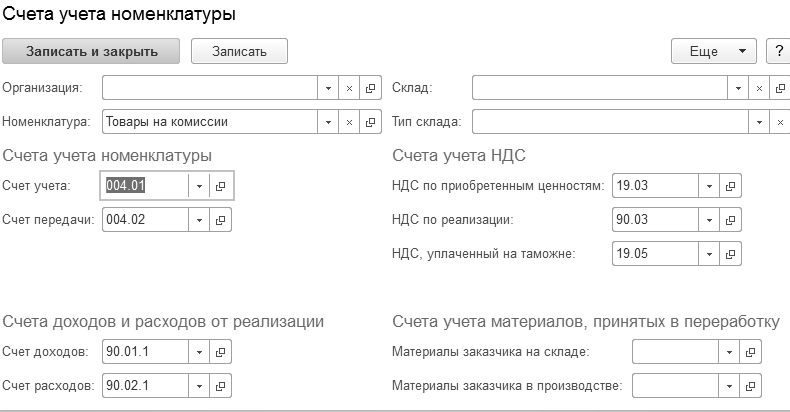 Если заполнить документ "Поступление товаров и услуг", и обратиться к группе "Товары на комиссии", туда занести элемент, то проведенный документ создаст бухгалтерские и налоговые проводки в дебет 004.01 на сумму полученных товаров, и отразит их количество. Рассмотрим пример по комиссионной торговле.
