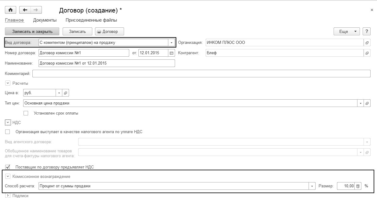 Вид договора – "с комитентом (принципалом) на продажу" |
