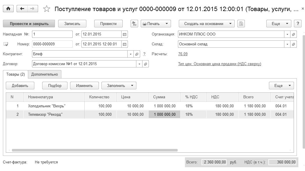 12.01.2015 года создайте документ "Поступление товаров и услуг" от комитента "Блеф" по договору комиссии № 1 от 12.01.2015 г. Организацией "Блеф" представлена накладная № 1 от 12.01.2015 г. на сумму 2 360 000 руб.