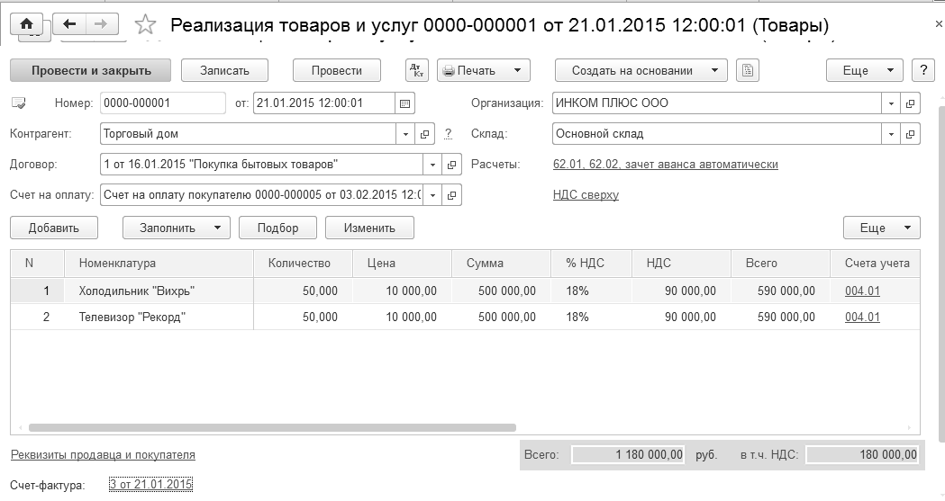 16.01.2015 года выпишите счет для ООО "Торговый дом" на сумму 1 180 000 руб., в т.ч. НДС 18%, по позициям (цена без налога):