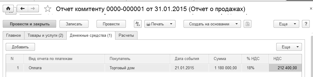 o 21.01.2015 года реализованы товары по цене Комитента на сумму 1 180 000 руб. (в т.ч. НДС 18 % 180 000 руб.) согласно отчету комиссионера;