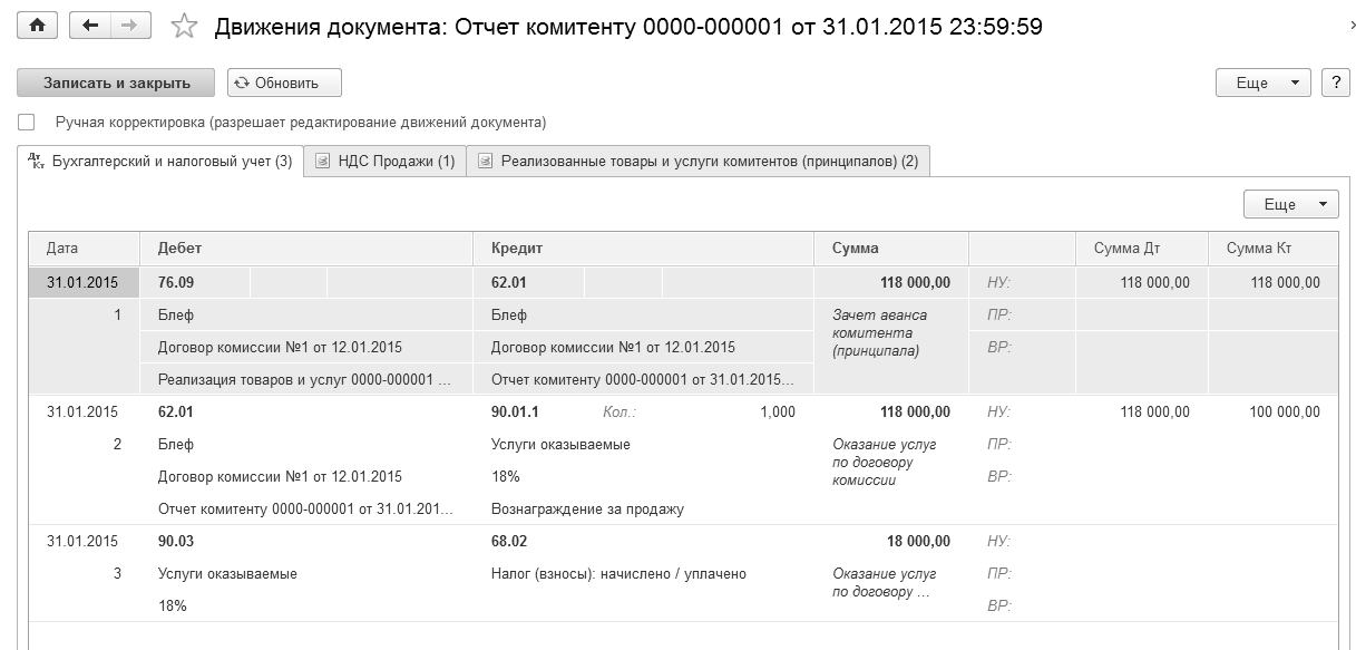 Проведенный документ сформирует проводки, где комиссионером будет начислено комиссионное вознаграждение в сумме 118 000 руб. (рис. 13.4.9).