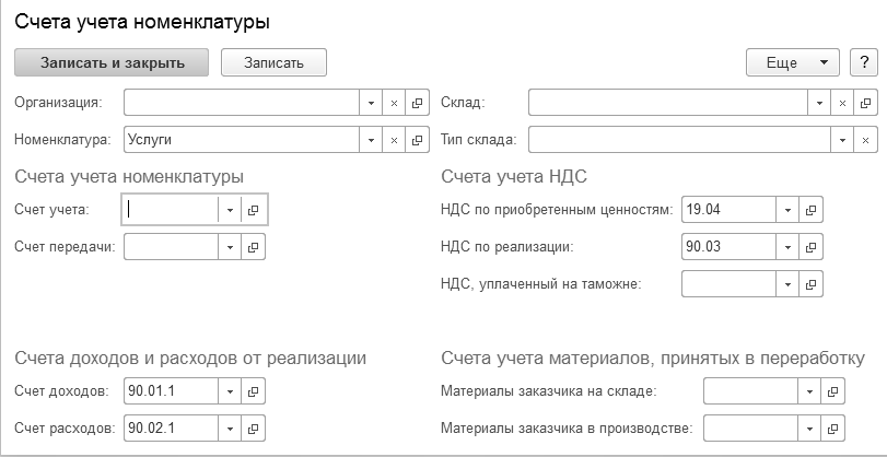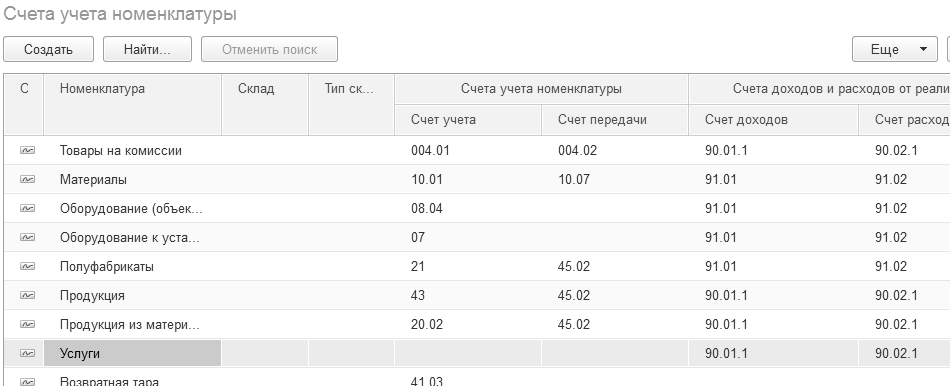Рис. 13.3.1. Счета учета номенклатуры для номенклатурной группы "Услуги"