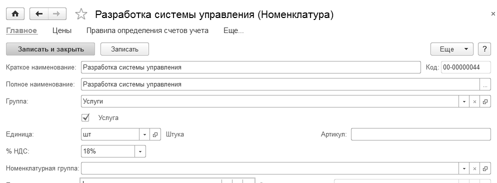 Заполните шапку документа согласно условиям примера. Вид операции "Услуги". В табличной части укажите услугу "Разработка системы управления". На этой закладке указываются только те элементы справочника "Номенклатура", которые имеют вид номенклатуры "Услуга", установите флаг "Услуга" (рис. 13.3.3).