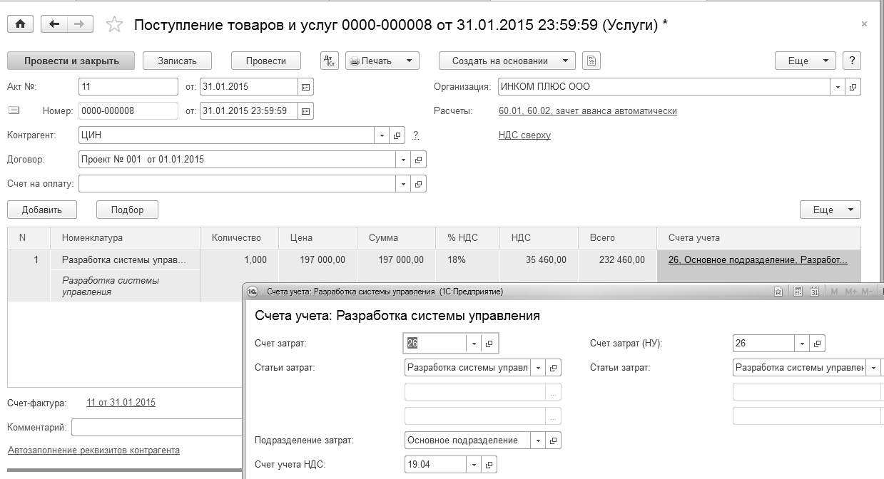 ООО "ЦИН" по проекту № 001 от 01.01.2015 года осуществляет разработку системы управления организации "ИНКОМ ПЛЮС". Цена услуги за январь 2015 г. по акту № 11 от 31.01.2015 года составила 197 000 рублей (НДС сверху). Организацией "ЦИН" представлен счет – фактура № 11 от 31.01.2015 г. на сумму 232 460 руб. Затраты списываются на счет 26 на основное подразделение по статье затрат – "Разработка системы управления".