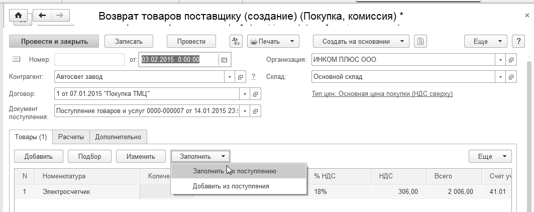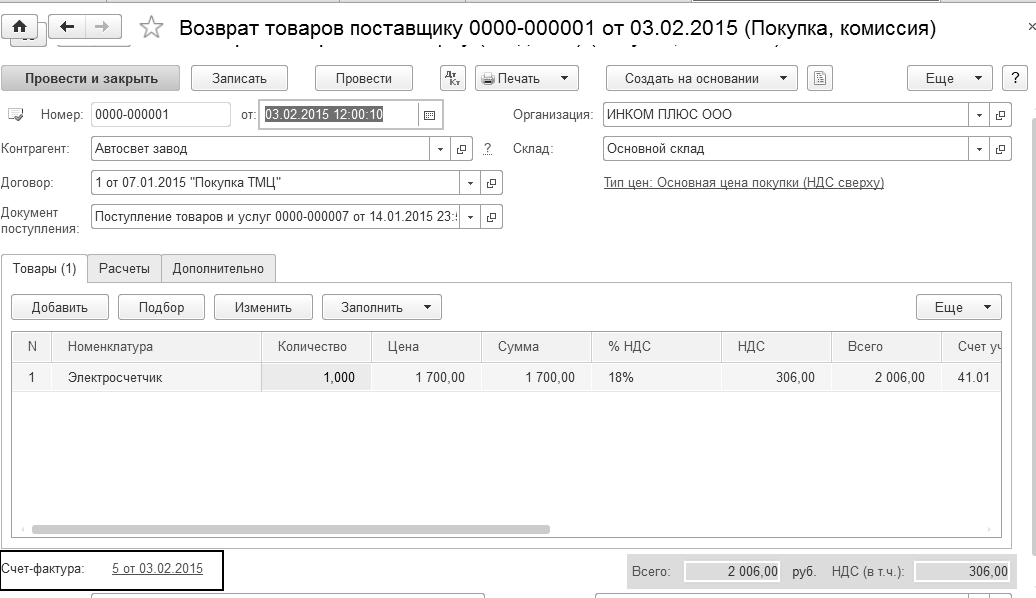 03.02.2015 года был возвращен товар поставщику "АВТОСВЕТ". Возвращается электросчетчик 1 шт., который был получен 14.01.2015 года по договору № 1 от 07.01.2015 г. "Покупка ТМЦ". Причина возврата – электросчетчик оказался бракованным.