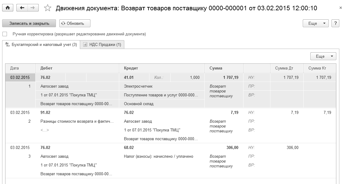 Рис. 13.5.3. Движение документа "Возврат товаров поставщику",