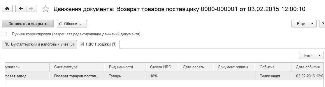 В 2007 году вышло письмо МФ РФ от 07.03.2007 № 03-07-15/29, где сказано, что в случае возврата товаров поставщику налогоплательщик должен выписать счет-фактуру на возвращаемые ценности и зарегистрировать ее в книге продаж. При возврате бывший покупатель начисляет ровно ту сумму НДС, которую предъявил к вычету при покупке. При формировании отчета "Книга продаж" данные о возврате будут в нем отражены при помощи регистра накопления "НДС продажи".