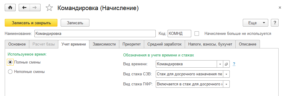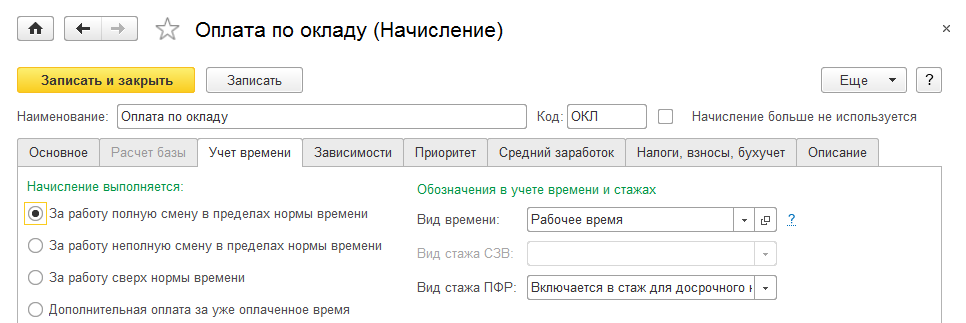 Начисление за работу полную рабочую смену в пределах нормы времени (отработанное время в пределах нормы времени). Означает, что время, отработанное по виду начисления, оплачивается в пределах нормы времени. Это только такие начисления как, оклад по дням, оплата по дневному тарифу. Сотруднику одновременно может быть назначен только один вид расчета с таким переключателем.