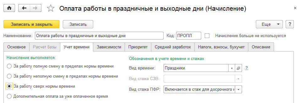 Начисление за работу сверх нормы времени (отработанное время сверх нормы времени). Оплачивается время, отработанное сверх нормы времени, например, оплата сверхурочных часов или за работу в выходные по графику дни, нерабочие по графику.