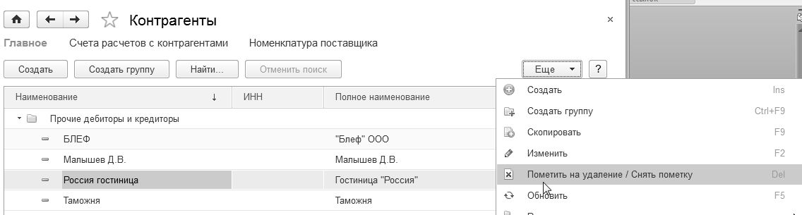 · В форме справочника (документа) обратиться к кнопке "Еще/Пометить на удаление/Снять пометку" (рис. 1.14.1);