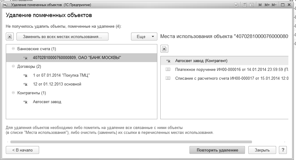 Здесь можно увидеть те документы и справочники, которые "держат" в программе не удаляемые объекты. И если документы (элементы справочника), для работы нужны, то лучше снять пометку на удаление. Можно выполнить редактирование объектов, препятствующих удалению того или иного помеченного на удаление объекта, после чего повторить процедуру удаления.