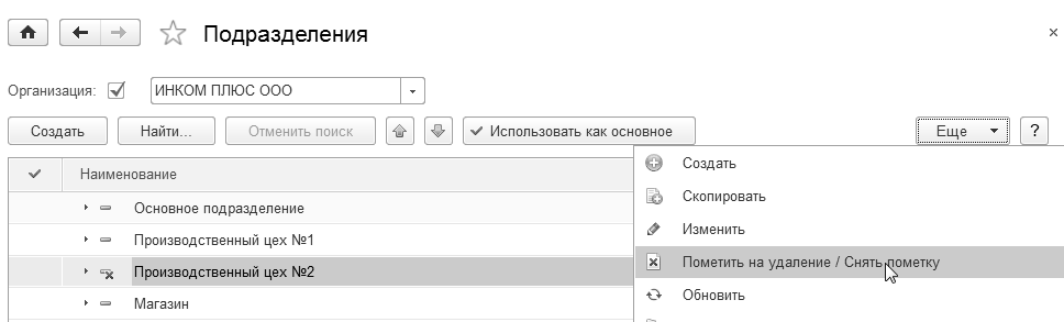 Откройте справочник "Подразделения" и пометьте на удаление элемент – "Производственный цех № 2". Для этого обратитесь к командной панели "Еще/Пометить на удаление" или применить пиктограмму (рис. 1.14.3).