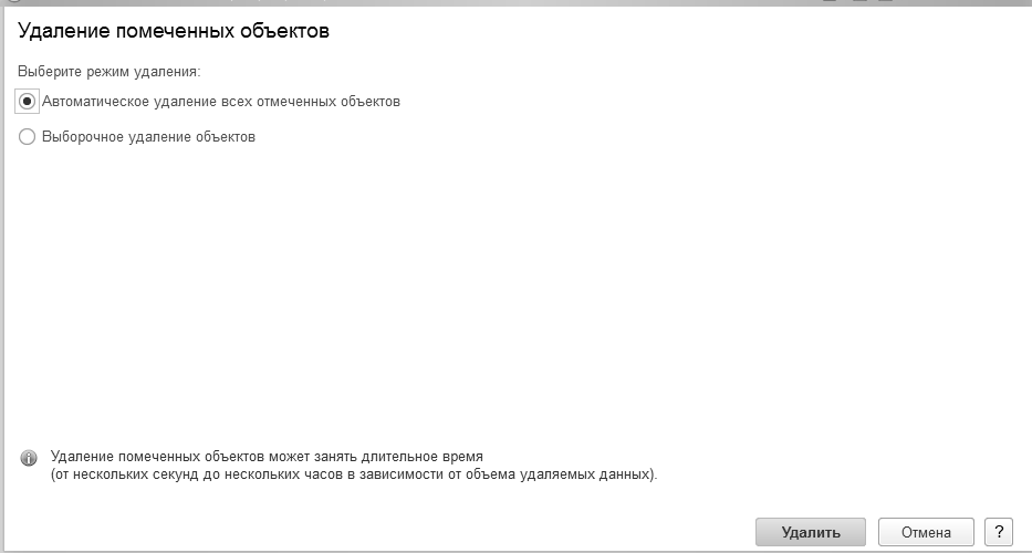 Различают два режима удаления: непосредственное удаление и пометка удаления. Доступность режимов определяется правами конкретного пользователя.