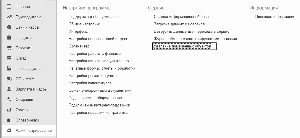 (меню "Панель разделов/Администрирование/Панель навигации/Сервис/Удаление