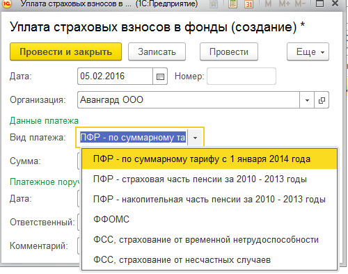 Для регистрации сумм уплаченных страховых взносов к отчетности используется документ "Уплата страховых взносов в фонды". Он доступен в разделе "Налоги и взносы".