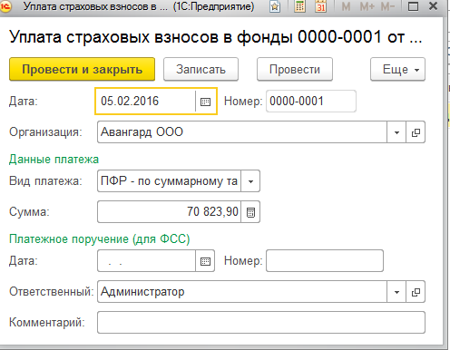 Документ создается отдельно на каждый вид платежа. Дата документа – это дата уплаты, также в документе указывается сумма уплаченных взносов, а для уплаты в ФСС – реквизиты платежного поручения.