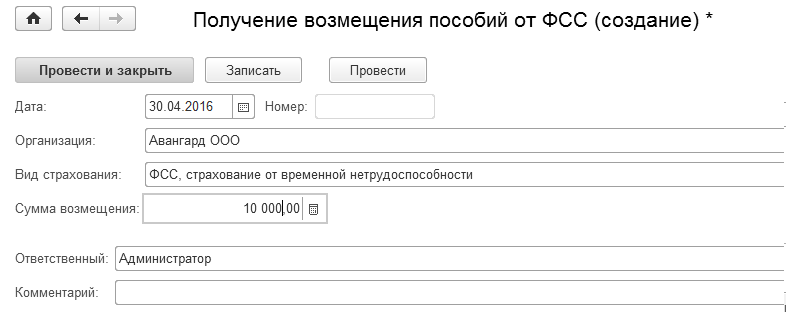 Также для регистрации взаиморасчетов с фондами может использоваться документ "Получение возмещение пособий ФСС" (раздел "Налоги и взносы"), если ФСС возмещает организации расходы по больничным и другим пособиям.