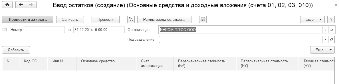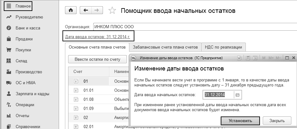 Установите дату ввода начальных остатков 31.12.2014 г.