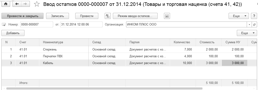 Проверьте итоговую сумму документа "Ввод остатков" по рисунку 5.3.2.