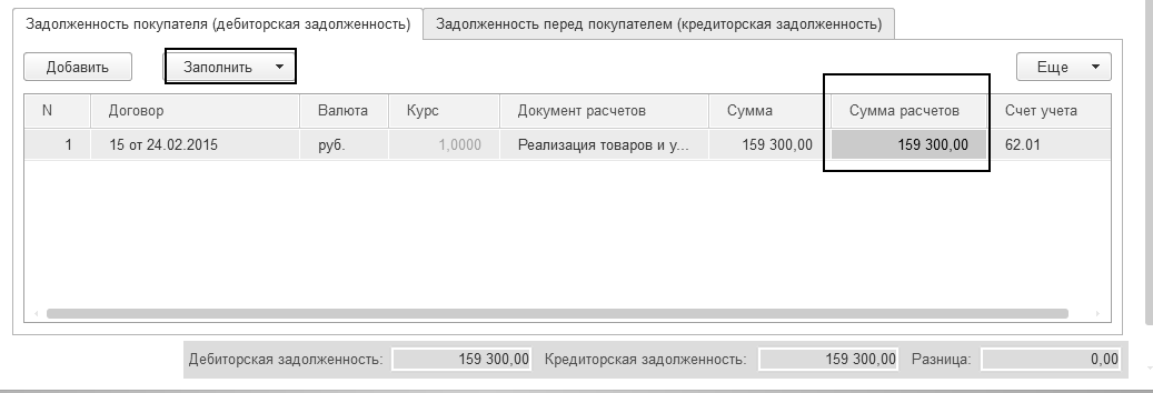 Заполните табличную часть закладки "Задолженность покупателя (дебиторская задолженность)"  документа при помощи кнопки "Заполнить/Заполнить остатками по взаиморасчетам" – появится  строка на сумму 160 000 руб.